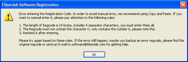 1. The length of Regcode is 24 bytes, includes 4 separator characters, you must enter them all.
