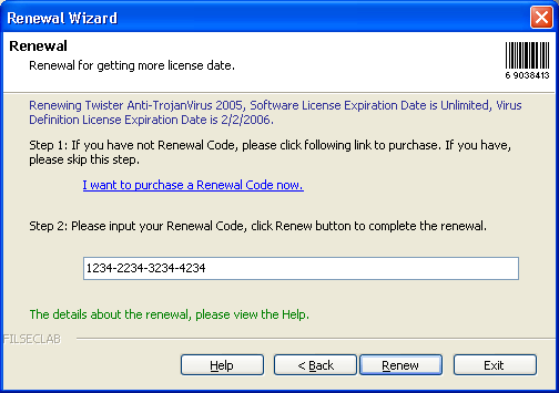 The renewal need to purchase a Renewal Code first, the Renewal Code have a license date, after renewal, its license date will be appended to your current license date. There have two types of appending date, one is directly appending to current expiration date if it has not expired when you renewal. one is appending the license date to current date if it has been expired when you renew. For example: If your virus definition date is 2/19/2006, and now is 4/19/2005, you are using 1 year Renewal Code to renew your software, the new expiration date should be 2/19/2007 after renewal. If you are renewal at 4/19/2006, the new expiration date will be 4/19/2007, it is used to append to the current date, this way can ensure your renewal is full available.