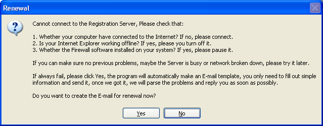 - Maybe our server broken temporarily, if it is this problem, you may wait for 30-60 minutes and try again, because the server problem may be automatically recovered. If the error always occurs, you may click Yes button to request for renewal using email. About the details, please view "Request for Renewal using E-mail¡±