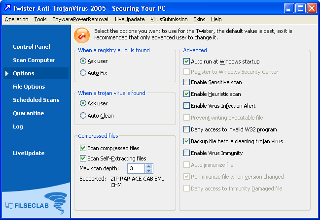 • Register to Windows Security Center: The Windows Security Center is a new feature supported by Windows XP Service Pack 2, so this option can take effect only on Windows XP Service Pack 2. The Twister Anti-TrojanVirus will be registered to Windows Security Center after this option enabled. About the details please view Windows Security Center .