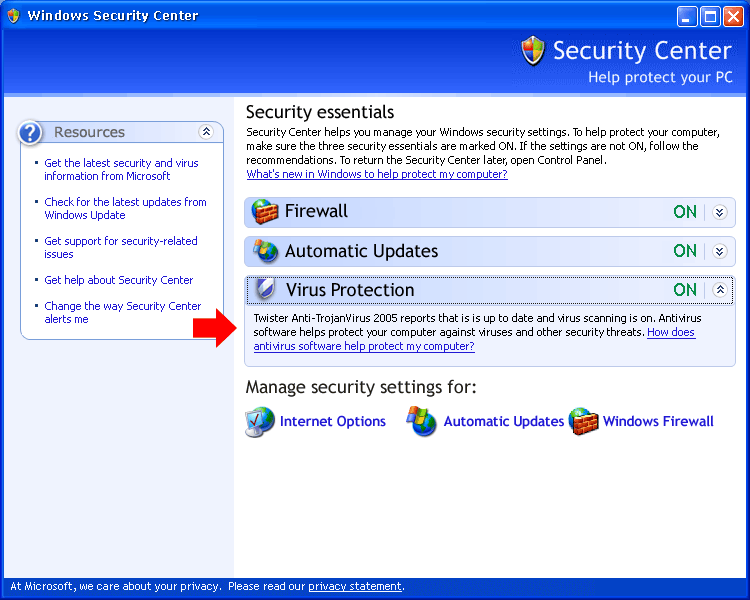 The Twister Anti-TrojanVirus 2005 supports the Windows Security Center. It will be shown at Windows Security Center once you install it on Windows XP Service Pack 2. The Windows Security Center will notify you when your Twister was shut down or virus definition is too old. These notification can help you to know the security status.