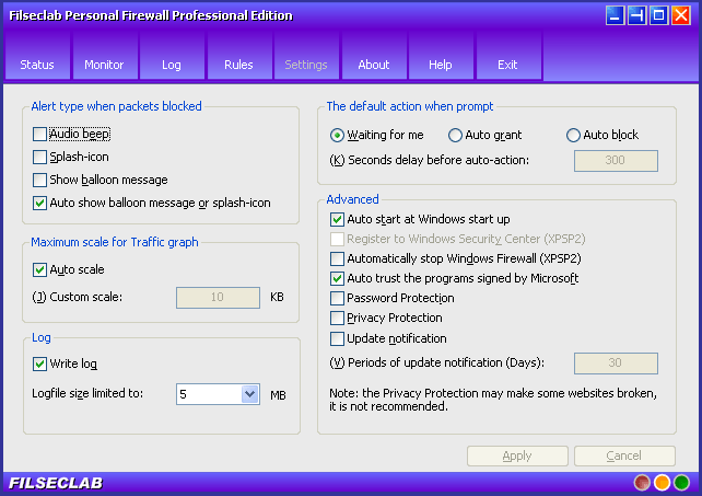 Automatically stop Windows Firewall (XPSP2): Automatically stop Windows Firewall when this firewall start and automatically start Windows Firewall when this firewall stop. This firewall offers protection more than Windows Firewall, you may feel free to stop the Windows Firewall when this firewall start. This is only available for Windows XP Service Pack 2.