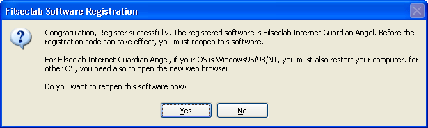 Click Yes, the registered program will be reopened for letting the registration code can take effect. Click No, before the registration code can take effect, you must exit the registered program and reopen it.