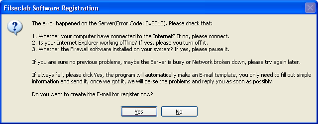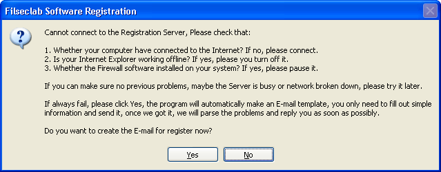 - Maybe our server broken temporarily, if it is this problem, you may wait for 30-60 minutes and try again, because the server problem may be automatically recovered. If the error always occurs, you may click Yes button to request for register using email. About the details, please view "Request for Register using E-mailĦħ