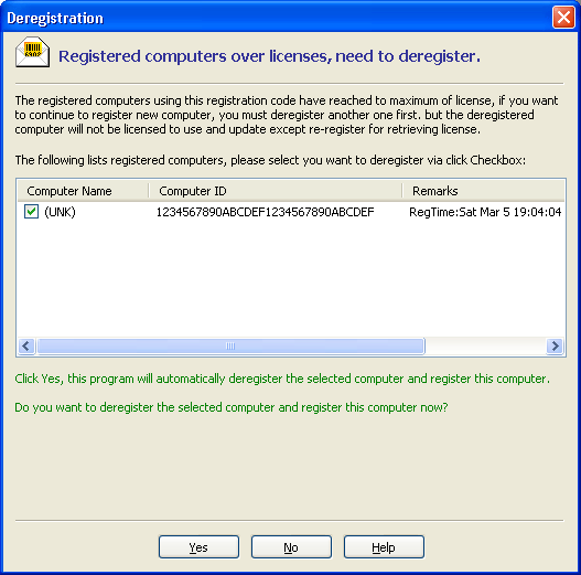 1. Deregister another one. If you did not want to use this software on one old computer, you may select it, click Yes to deregister it and register this computer automatically. Note: The deregistered computer will not be licensed and cannot live update.