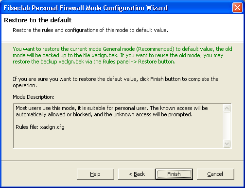 Click Finish button, the program will backup current mode file first and use the default mode file to overwrite the current. You may re-restore to current status from Rules -> Restore button to restore the backup file.