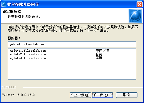 在此画面可以指定升级服务器。为了提高升级速度,我们启用了多个服务器,您可以选择根据所在地区选择其中的一个。一般可以使用默认设置,当一个不能连接时本程序也会自动尝试另一个,所以直接按“下一步”即可。