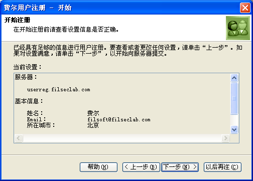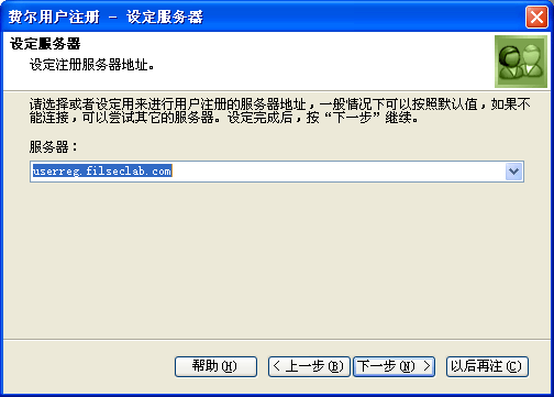 利用此界面可以指定注册服务器,一般使用默认值 userreg.filseclab.com 即可,如果不能连接到服务器,可以尝试使用 www.filseclab.com,或直接访问我们的网站 http://www.filseclab.com看是否有变动说明。