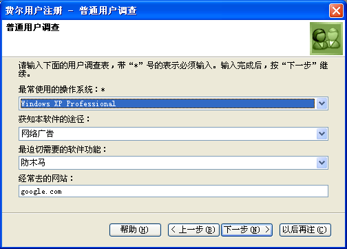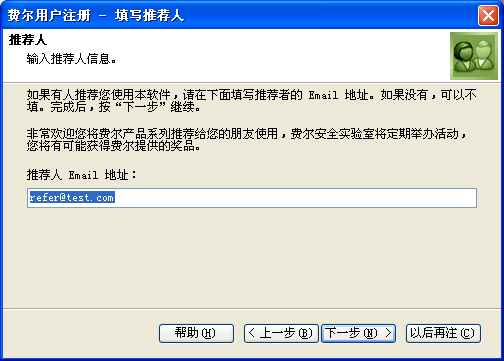 如果是别人推荐您使用费尔软件,您可以在这里输入推荐人的E-mail地址。如果没有,可以不用输入,直接按“下一步”即可。
