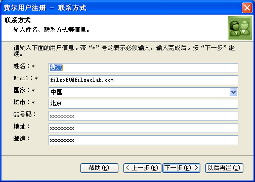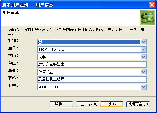 用户注册 和 软件注册 有着根本的区别。用户注册是用来提交用户信息和进行用户调查的程序,它用来表明您使用了费尔列软件。而软件注册,是使用注册码对软件进行注册,注册后的软件将从试用版变成正式版。用户注册是不能注册软件的。