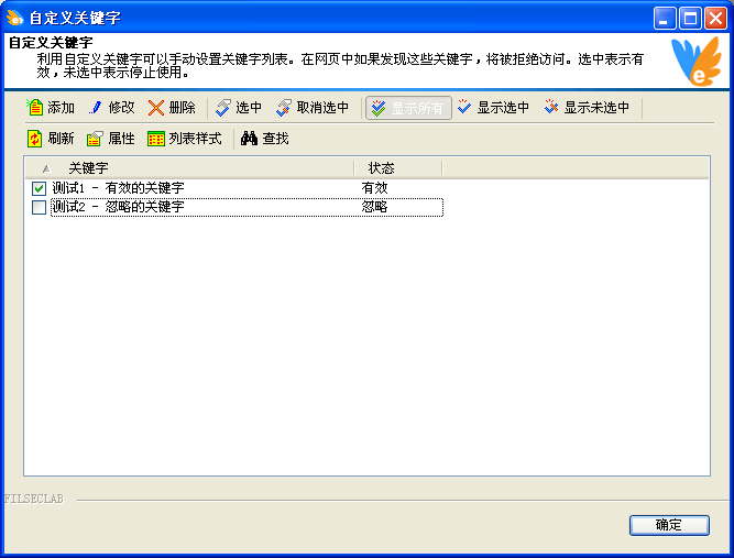利用关键字窗口,可以增加或停用自定义的关键字。当网页中含有自定义的关键字,将被拒绝访问。增加自定义关键字后,设置为选中,则表示使用此关键字进行过滤,设置为 未选中,则此关键字将被忽略。