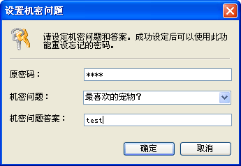 在设置机密问题前,必需先输入老的密码,然后选择或者直接输入一个机密问题,并设置一个不易 忘记的答案,按确定按钮保存即可。