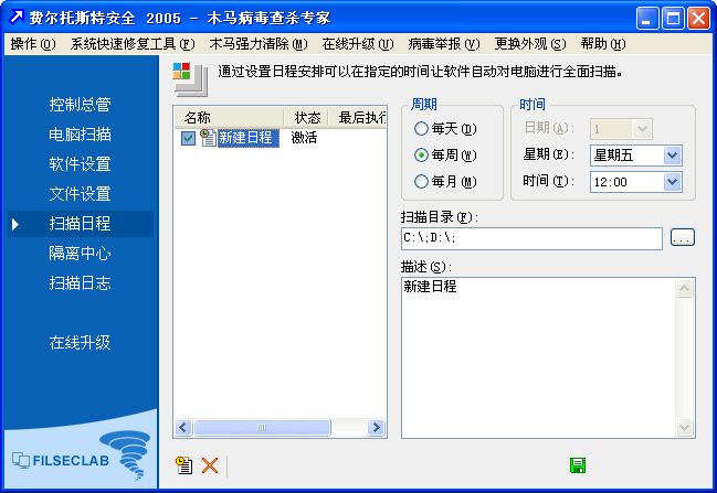 扫描日程用于扫描计划的制定,可以让费尔托斯特安全在指定的时间到来时自动对电脑进行扫描。 比如,如果您希望在每周五中午12:00外出就餐时让费尔托斯特安全自动扫描电脑,那么就可以通过安排扫描日程来实现。