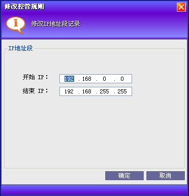 你可以在此界面中新增或编辑一个 IP 地址段。注意:开始IP地址必须小于或等于结束IP地址,如果 你只想控制一个IP地址,可以将它们设置成同一个。