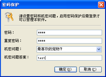 在 系统设置 窗口中选中“密码保护”选项,将 弹出下面的对话框让你设置密码和机密问题,设置机密问题可以在忘记密码时重设密码。