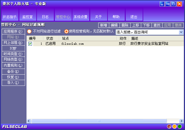 示例一:假如在你访问某个站点时,比如:www.adware-xxxx.com,它总是自动下载并安装一些东西到 你的计算机,你可以创建一条网站规则并载站点栏中输入 adware-xxxx.com,动作设置成“拒绝”,并 应用此规则,这样 adware-xxxx.com 的整个站点都会被拒绝,广告也不会再烦你了。关于规则的详细 说明请参考 这里。
