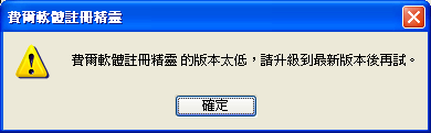 這是由於您目前使用的 費爾軟體註冊精靈 版本太低而造成無法完成註冊,這時您需要對它進行升級。費爾軟體註冊精靈 是一個公用模組,它一般會被包裹在軟體的安裝盤中,所以您只要下載軟體的最新安裝盤升級安裝即可。