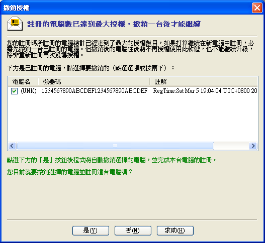 1、撤銷一台。如果您不打算在老的電腦中繼續使用,可以在選擇要撤銷的電腦後,點選「是」按鈕來自動撤銷老的電腦並完成本台電腦的註冊。但需要注意:撤銷後的電腦將不再授權使用而且不能線上升級。