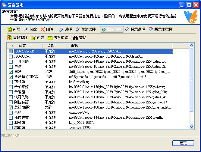 用來設定某種語言的存取權限,另外也可以自定義語言。軟體本身內定了全球常見的 18 種語言編碼。預設多語種(UNICODE)、英語、簡體中文、繁體中文和日語允許存取,並智能防堵。其它語言預設拒絕存取。如下圖:
