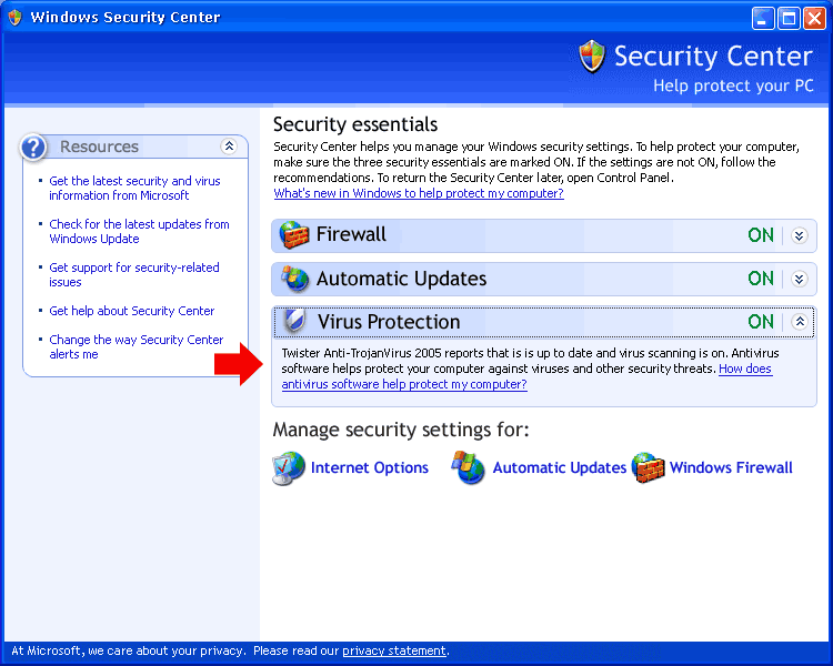 費爾托斯特安全 也及時得到了 Windows 資訊安全中心的相關技術支援,並在 2005 中提供了此功能。 目前,只要您把它安裝在 Windows XP SP2 或更高版本的 Windows 中後,Windows的安全中心就會自動檢測出 「費爾托斯特安全(Twister Anti-TrojanVirus) 2005」的存在並告訴您電腦處於受保護中。 如果費爾托斯特安全被意外關閉或病毒碼長期沒有更新時,Windows會提示您的電腦目前存在著風險。 這些提示和建議會讓您及時瞭解電腦的安全狀態,從而做好必要的防禦措施,也會讓費爾托斯特安全 發揮出更好的效能,讓您使用的更安心。