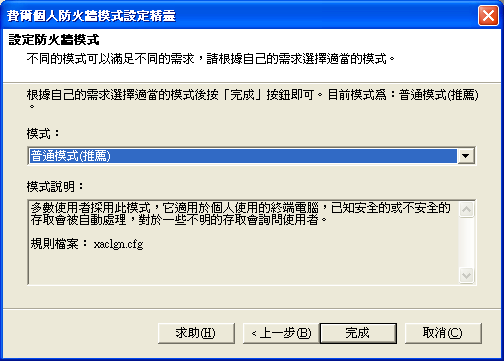 普通模式 (推薦):多數使用者採用此模式,它適用於個人使用的終端電腦,已知安全的或不安全的存取會被自動處理,對於一些不明的存取會詢問使用者。規則檔案: xaclgn.cfg