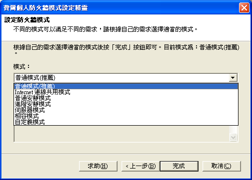 選擇一個模式並按「完成」按鈕完成模式設定。當你選擇一個模式後,它的說明將隨之被顯示在下方