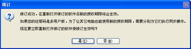 按“是”后将自动重启续订的软件立即使新的授权期限生效。如果选择“否”,新的授权期限会在下一次重新打开此软件时生效。