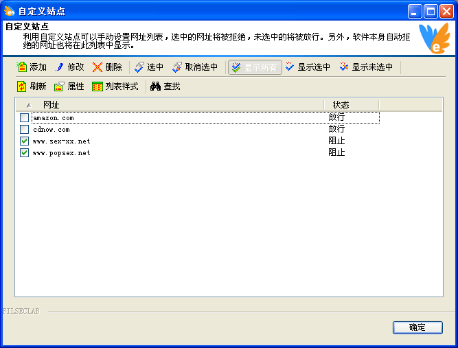 利用自定义站点窗口,可以设定放行或拒绝的站点。增加自定义站点后,设置为 选中,则此站点被拒绝,设置为 未选中,则此站点被放行。选中的称为黑名单,为选中的则是白名单。