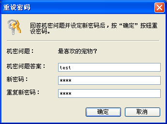 在设置机密问题后,可以在忘记密码的时候利用回答机密问题来重设密码。在此对话框中输入 机密问题答案,然后设置一个新的密码,按确定按钮即可。