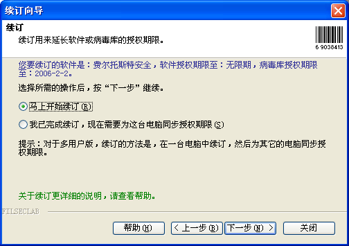 蓝字部分显示要续订的软件以及软件和病毒库的授权期限,请确认无误后再进行下一步操作。如果从未进行过续订,而且现在需要续订,则选择“马上开始续订”选项,然后按“下一步”继续。