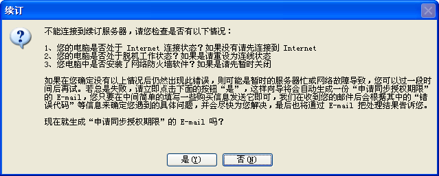 - 可能是我们的服务器暂时发生了故障,如果是这种情况您可以隔一段时间(30-60分钟)后再试试,因为一般服务器出现问题后可在一段时间后恢复。如果一直不行则可以点击上面对话框中的“是”来进行E-mail申请续订,请参考 如何用 E-mail 申请续订 。