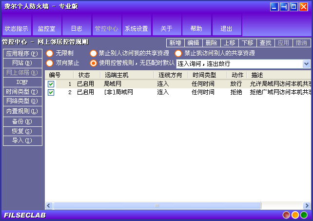 网上邻居规则用来控制网上邻居共享资源的访问(139 端口)。规则画面如下: