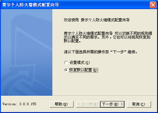 你可以使用 模式向导 恢复当前模式的规则和配置到默认状态。 按 主界面 上的“切换模式”按钮,模式向导对话框将被弹出, 选择“恢复默认配置”,如下图: