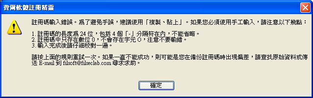 當發生此錯誤時一般是因為註冊碼輸入錯誤造成,請您仔細校對輸入的註冊碼是否完整而且正確。另外,在註冊碼中一定不會包括字元「O」,只會有數位「0」,由於它們看起來比較相似,所以注意不要輸錯。如果您瞭解Windows的「複製,貼上」如何使用,建議您使用這種方法輸入註冊碼,這樣可以避免手誤。