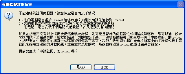 - 可能是我們的註冊伺服器暫時發生了故障,如果是這種情況您可以隔一段時間(30-60分鐘)後再試試,因為一般伺服器出現問題後可在一段時間後還原。如果一直不行則可以點選上面對話框中的「是」來進行「Email申請註冊」。有關方法請參考「申請註冊的方法」