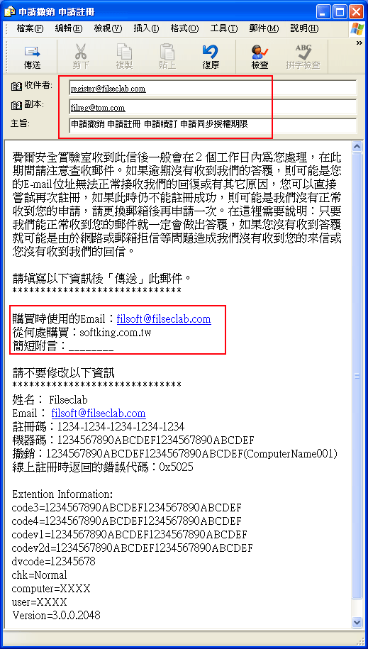 3、信件中必需附帶以下資訊:註冊碼、購買時的 E-mail 地址、機器碼。關於如何得到機器碼,請參考:如何得到機器碼。