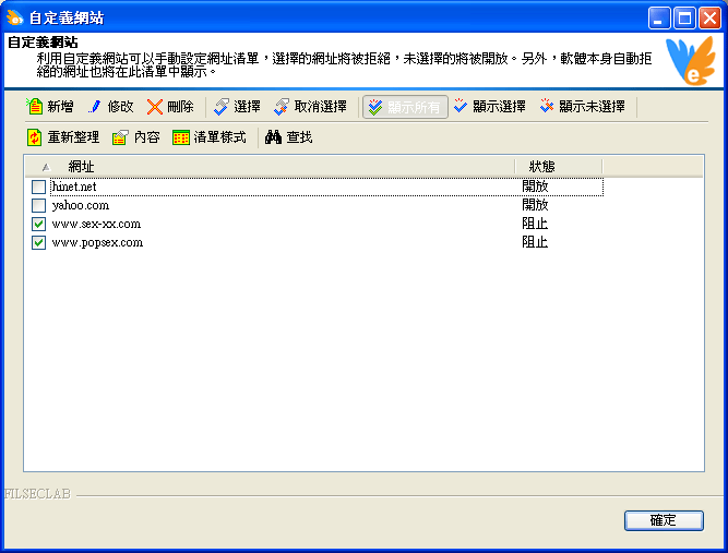 利用自定義網站視窗,可以設定開放或拒絕的網站。新增自定義網站後,設定為 選擇,則此網站被拒絕,設定為 未選擇,則此網站被開放。選擇的稱為黑名單,為選擇的則是白名單。
