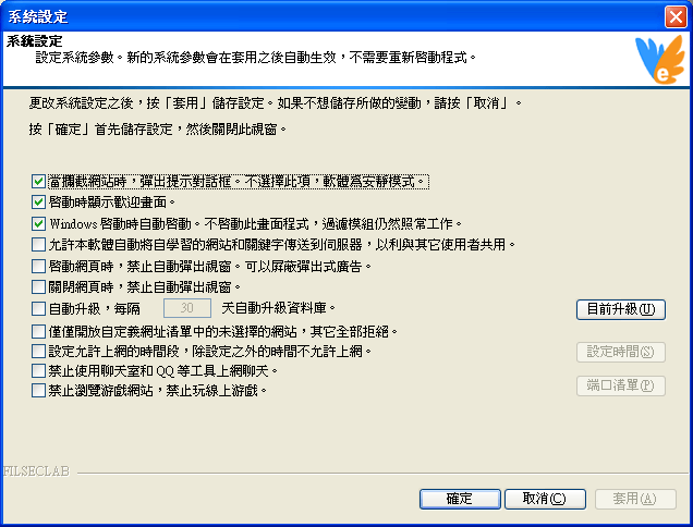 這裡允許軟體定期自動從費爾安全實驗室網站下載最新的資料庫。資料庫內容主要包括網址庫和色情關鍵字庫。費爾安全實驗室會不斷的搜索色情網址來豐富網址庫,並定期發佈。