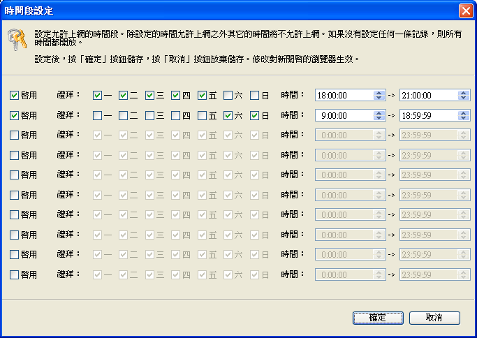 此選項需要配合自定義網址清單來實現。首先選擇此選項,然後在自定義網址清單中加入要開放的網站,然後將其設定為 未選擇 狀態。這樣設定後,只有網址清單中 未選擇 狀態的網站會被開放,其它的任何網站都會被拒絕。另外自定義網站從3.0 往後支援模糊匹配,詳情請存取 自定義網站。 比如你希望孩子僅僅能夠存取教育網站,可以在自定義清單中加入一條 「.edu」 的記錄,然後將其設定為 未選擇 狀態,並在系統設定中選擇此選項。這樣就只能存取 .edu 的教育網站了。同理可以設定存取 政府網站 .gov,中文網站 .cn 等,可以按照自己的需求靈活設定。 使用此設定可以對上網時間進行控制。設定了允許的上網時間後,除此之外的時間都不能夠上網。 設定方法為:選擇此選項,然後點選「設定時間」按鈕,彈出如下對話框: 設定開放的時間段,並選擇設定好的時間段,完成後按「確定」儲存設定。再新開啟的瀏覽器將受此時間段的約束。目前支援10個時間段的設定。 為了限制在上學期間的上網時間,可以設定禮拜一到禮拜五隻有從晚上6點到晚上8點才可以上網。而禮拜六、禮拜日則可以放寬,設定為從早上8點到晚上10點可以上網。 軟體內建了一些網上聊天的關鍵字,選擇此選項後,這些關鍵字將被啟用。用來禁止進入聊天室和進行網上聊天。 另外,可以通過對連接埠的控制來實現對聊天工具的控管。連接埠可以通過「連接埠清單」來設定,軟體內定了對 QQ、ICQ 和 MSN Messenger 的連接埠。對於其它的聊天工具可以通過自定義來實現控管。啟用此選項後,連接埠清單中含有的關於聊天工具的連接埠將被拒絕存取,從而將無法使用聊天工具進行聊天。 關於連接埠清單如何設定,請參閱 連接埠清單檔案格式說明 軟體內建了一些游戲的關鍵字,選擇此選項後,這些關鍵字將被啟用。用來禁止進入線上游戲網站。