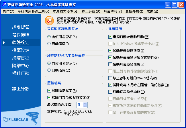 掃瞄壓縮檔案:在進行 電腦掃瞄 時是否對壓縮檔案自動掃瞄。