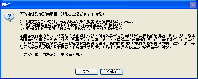 出現此情況表示續訂後新的授權期限已經更新到中央伺服器,但還沒有成功的下載到您的電腦中,這時您可以按「確定」,程式會自動切換到 同步授權期限 的畫面,然後您再手動嘗試同步一下授權期限一般即可解決。