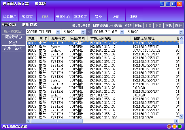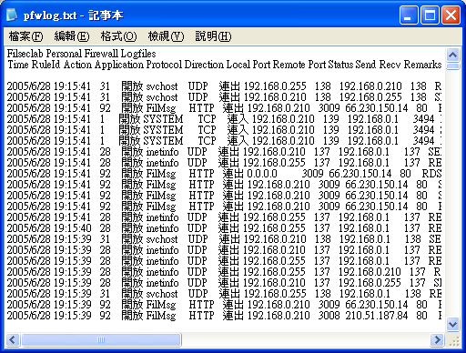 點選「文字日誌」按鈕開啟文字日誌。文字日誌沒有分類,它會直接記錄下應用程式、網路芳鄰和 ICMP 日誌。文字日誌檔案的大小限制與二進位日誌相同,它們都是從「系統設定」視窗中統一設定的。文字 日誌的視窗如下: