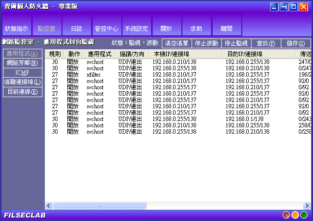 監控室用來即時監控網路活動,它包括應用程式監控、網路芳鄰監控、ICMP監控、偵聽連接埠監控和 目前連線監控。畫面如下: