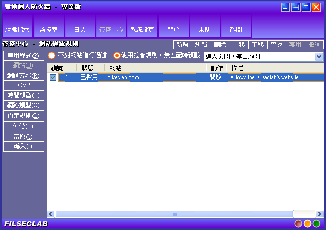 示例一:假如在你存取某個網站時,比如:www.adware-xxxx.com,它總是自動下載並安裝一些東西到 你的電腦,你可以創建一條網站規則並載網站列中輸入 adware-xxxx.com,動作設定成「拒絕」,並 套用此規則,這樣 adware-xxxx.com 的整個網站都會被拒絕,廣告也不會再煩你了。關於規則的詳細 說明請參考 這裡